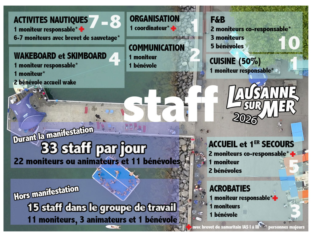 Nous cherchons des jeunes entre 15-20 ans, disponibles une ou deux semaines complètes (du mercredi au dimanche) pour travailler à l’accueil, à l’espace acrobaties, à l’espace air bag au bar, au wakeboard ou pour gérer nos réseaux sociaux. Si tu es motivé-e, envoie un mail à staff @ lausanne-sur-mer.ch, dis-nous tes préférences de lieu de travail, tes disponibilités (le plus tu es dispo, le mieux c’est) ainsi que ton mail, ta date de naissance et ton numéro de téléphone.